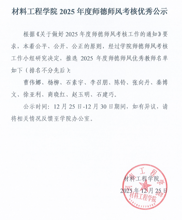 材料工程学院2025年度师德师风考核优秀公示