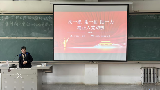 为深入学习贯彻习近平新时代中国特色社会主义思想,引导入党积极分子在学习生活中主动对标党员要求,材料工程学院于10月14日中午12:00在桐柏校区工美楼217以“端正入党动机”为主题开展分党校第37期入党积极分子党课培训。学院党委副书记金玲为本次党课主讲人。