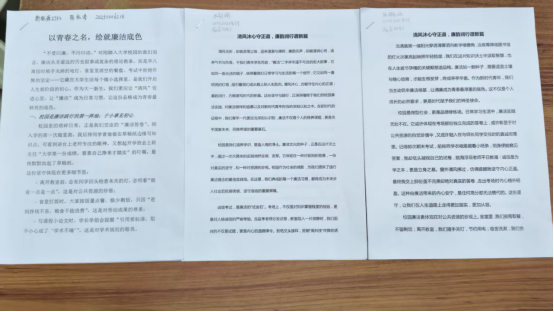 活动一经开展,便得到学子们的积极响应。同学们围绕“校园廉洁实践”“廉洁榜样学习”“青年廉洁担当”三大方向,结合自身经历用心创作。征文作品中,大家结合诚信考试,节约资源等校园场景,阐述对廉洁的思考;短视频作品里,学子们通过情景演绎,展现身边的廉洁小故事;手抄报与海报作品则以鲜明画面和有力文字,传递“崇廉尚洁”的价值理念。评审小组从内容契合度、原创性和思想深度等维度综合评选,最终评出一等奖2名,二等奖3名,三等奖4名,优秀奖8名。