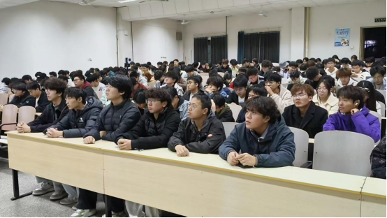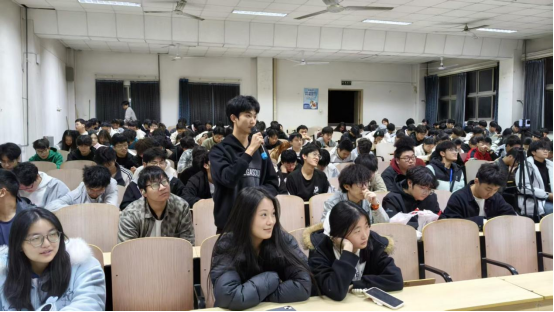 活动中,郭牧野带领大家回顾学校自1910年河南省官立中等工业学堂创立以来的发展历程,从实业救国的初心到郑州经济管理干部学院与河南纺织高等专科学校合并组建河南工程学院的跨越发展,重点讲述1960年师生自主研发“气流纺纱机”并获毛泽东主席视察的辉煌历史。现场播放精心制作的专题视频,通过珍贵影像资料再现学校在不同历史时期的重要节点与感人故事。深情讲述优秀校友代表赵海雷和王焕如的伟大事迹。在互动问答环节中,同学们积极参与,深刻体现出同学们对校史的关注和重视,现场掌声不断。