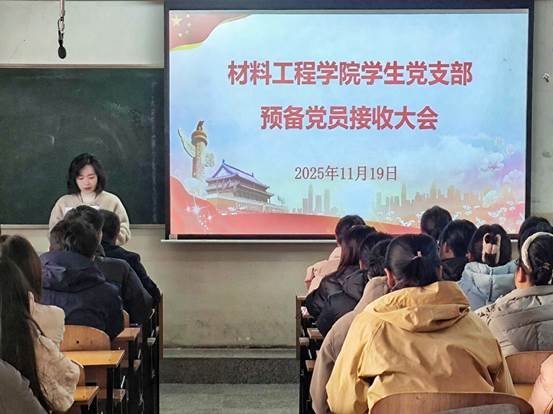 为进一步培养党的后备力量,吸纳优秀同志加入党组织,材料工程学院学生党支部于11月19日下午在桐柏路校区教室217召开预备党员接收大会,大会由学生党支部书记刘珈宁主持,学院党委书记辛长征、副书记金玲及全体师生党员参加。