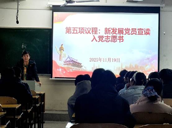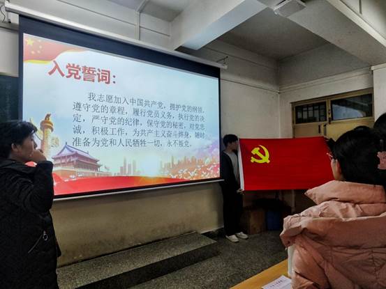 在入党宣誓仪式环节中,全体师生党员肃立奏唱《国际歌》,党员同志在歌声中感受到组织的温暖和力量。随后,刘珈宁宣读新党员名单,金玲领誓,新党员们共同感受入党宣誓仪式的庄严与神圣。接着,辛长征对新党员提出四点希望:一要牢记党的宗旨,坚定理想信念;二要加强党性修养,坚定政治方向;三要严格要求自己,坚定组织纪律;四要主动请缨担当,践行为人民服务。金玲强调,党员是一支强大的先锋团队,要时刻严于律己团结同学,发挥战斗堡垒作用。